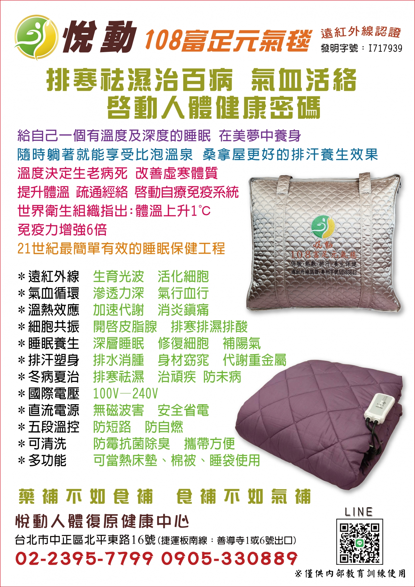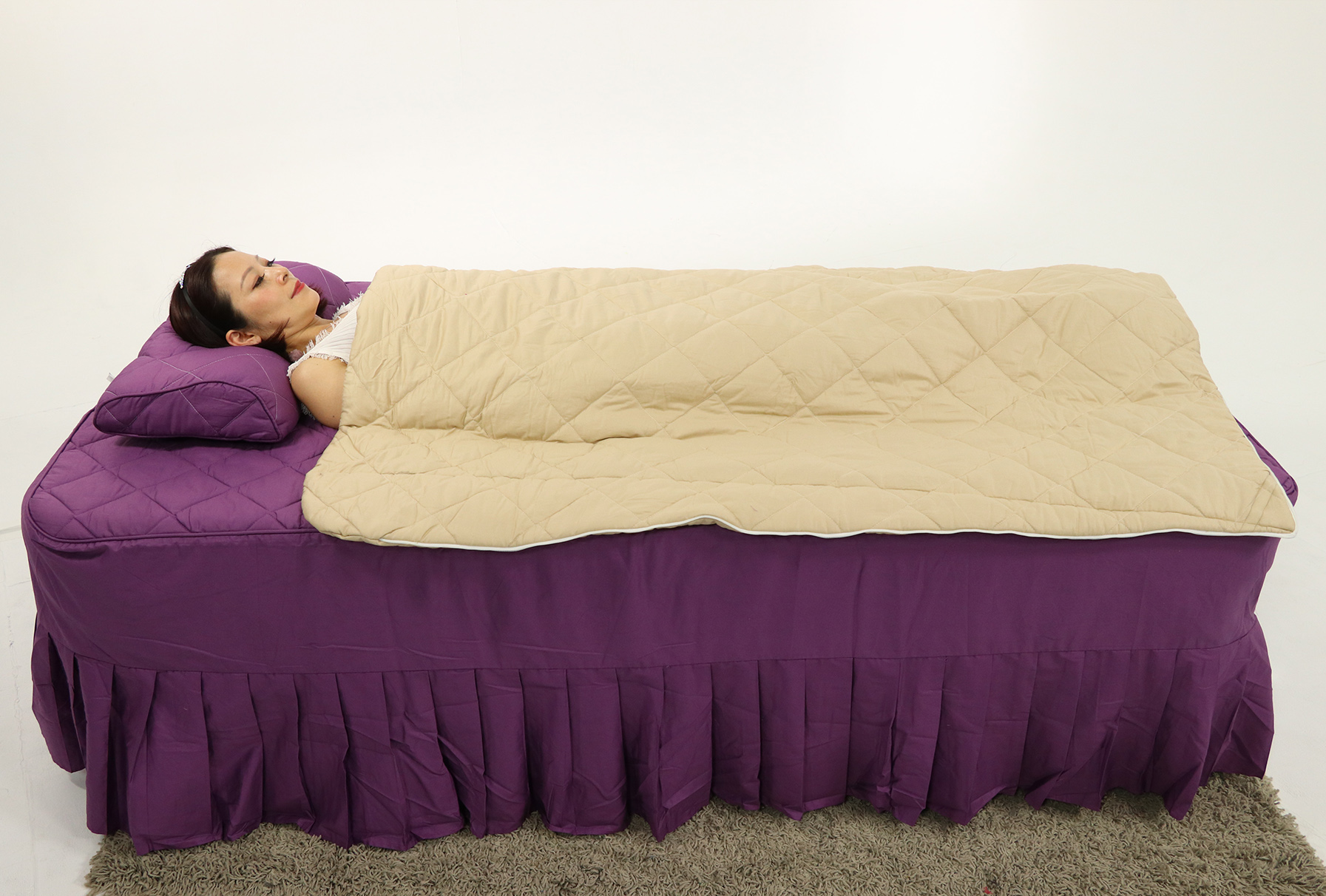遠紅外線能量、直流電沒有磁波害、防自燃、國際電壓100~240v,可當電毯、蓋被、熱療、輕巧攜帶方便等。